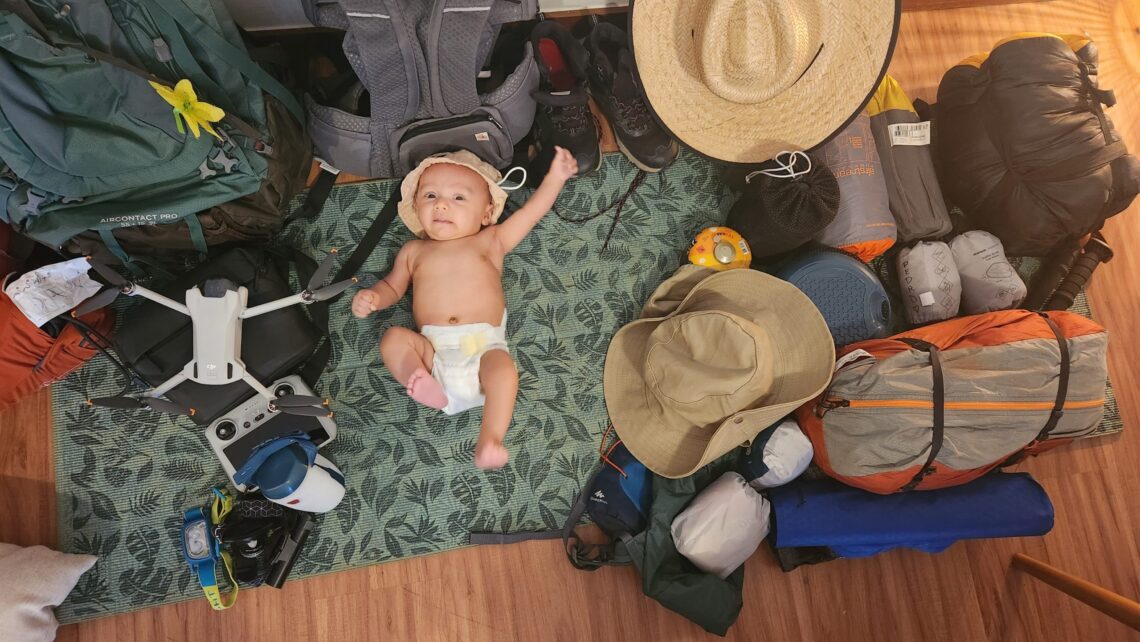 Aqui não tem muito segredo ou complexidade. Como ele ainda é bem pequenininho, não precisamos de nenhum equipamento específico para ele. Dividimos o saco de dormir e o isolante inflável. Levei tudo o que ele usaria no dia a dia e, como fomos no período de calor, levamos apenas roupas leves. Ele acabou nem usando metade, pois ficava só de fraldinha mesmo, por conta do calor.