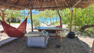 Nos organizamos no quiosque para passar o dia. A ideia desse berço portátil que levamos, seria para as hospedagens durante a viagem de 24 dias. Mas tivemos a excelente ideia de colocar ele no quiosque pra deixar o Dan e ficarmos mais tranquilos.